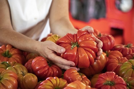 "The Riccio di Parma tomato is ribbed and very sweet, with a slightly acidic edge. The skin is thin, making it suitable only for hand-harvesting. This is one of the reasons it has fallen into disuse, as it cannot be harvested mechanically. The seedlings, which develop indefinitely, can grow up to two and a half feet tall. It can be eaten alone in salads or with other vegetables and is also suitable for sauces."