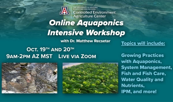 Are you interested in growing crops with aquaponics? Join the University of Arizona Controlled Environment Agriculture Center for the Online Aquaponic Intensive Workshop - October 19th & 20th via Zoom. This two-day event, taught by Dr. Matthew Recsetar, is perfect for those using or wanting to use small to medium-scale systems. Both sessions will be packed with tons of critical information to ensure your operation will be the most effective. Sign up today to get access to numerous lecture materials, personal question follow-ups, a certificate of completion, and tons of knowledge.