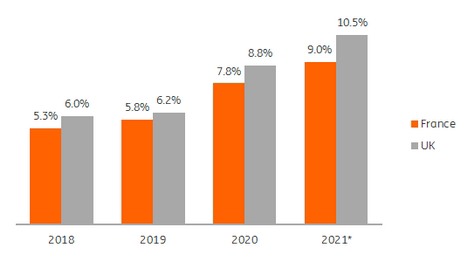 Share of online groceries as part of total grocery sales in France and the UK:
