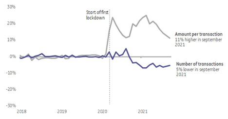 The impact of restrictions and curfews on the size of the average shopping basket has largely disappeared. What is left are requirements to wear a face mask in indoor places in some countries and the possibility of the re-introduction of some restrictions. Because the surge in larger shopping trips was primarily born out of necessity, it is less likely to stick post-Covid. At the same time, smaller shopping trips to (convenience) food retailers may remain under pressure due to reduced work and tourism-related footfall.