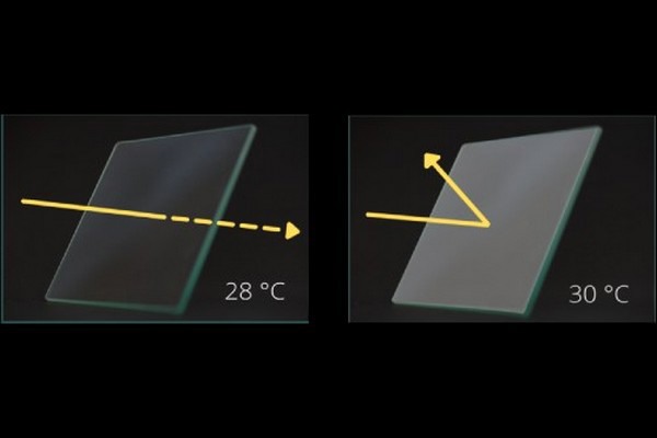 “Our coating would be applied once as a transparent layer. As the glass reaches a specific temperature, it would gradually become opaque, and then become clear again as it cools. The benefit is that it would allow passive temperature control throughout the year and not require the costly painting and removal.”
