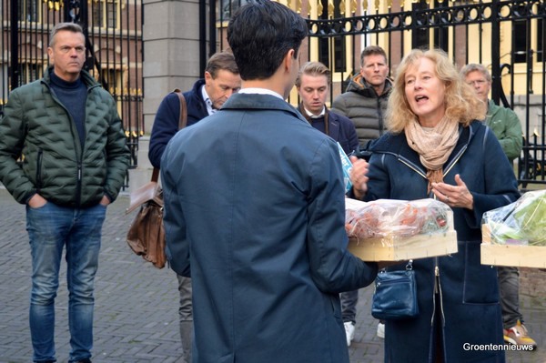 At around 10 a.m., when the ministers Jetten and Staghouwer, responsible for the energy crisis at the Climate and Energy and Agriculture, Nature and Food Quality ministries, came out, it was Adri Bom-Lemstra's turn to hand over a crate of vegetables to both of them, and to convey her message on behalf of the entire Dutch greenhouse horticulture sector.
