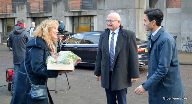 At around 10 a.m., when the ministers Jetten and Staghouwer, responsible for the energy crisis at the Climate and Energy and Agriculture, Nature and Food Quality ministries, came out, it was Adri Bom-Lemstra's turn to hand over a crate of vegetables to both of them, and to convey her message on behalf of the entire Dutch greenhouse horticulture sector.