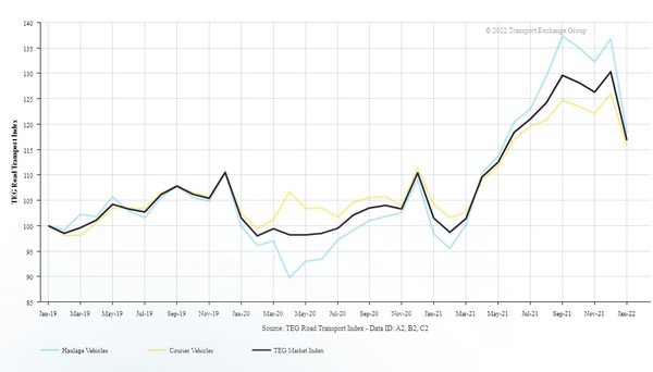 As in previous years, the price-per-mile dropped following the traditional surge for Christmas, having decreased by 13.5 points from December to January. But 2022 still kicked off with the highest January prices for haulage and courier vehicles since the TEG index began in 2019.