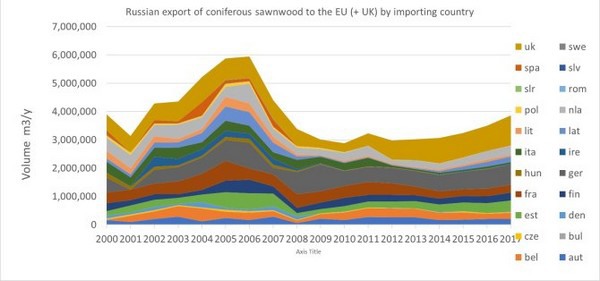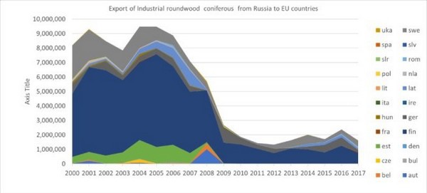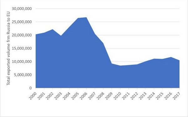 Figure 1. All timber and lumber exports from Russia to the EU, as a whole, since 2000.