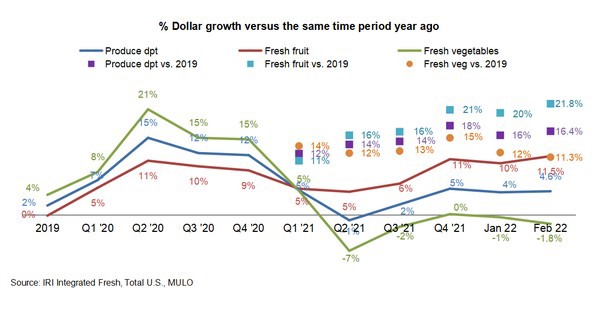 Fresh produce prices are also up from last year at a slightly higher rate than total food and beverages. In February 2022, the price per pound for total fresh produce increased by +10.9 percent over February 2021. Fresh vegetable inflation was far below average, at +6.2 in February, contrary to fruit that reached its highest levels seen yet, at +16.1 percent.