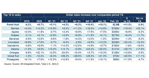 “On fruit, we had some shifts in the top 10 sellers in February,” said Parker. “While berries continued dominating the top 10, grapes moved in third and avocados moved up to fifth. Pineapples replaced lemons as the 10th largest seller this month.”