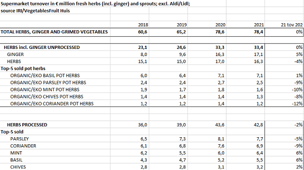 In the Dutch retail sector, the same five herbs have been best sellers for years (see table). The global pandemic increased the use of bottled and packaged herbs, and total supermarket sales of herbs, ginger, and sprouts remained level in 2021. That is according to data from GroentenFruit Huis.