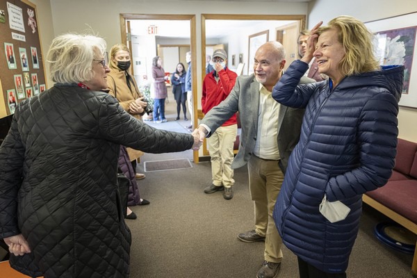 Kate VandenBosch, dean of the College of Agricultural and Life Sciences, shook hands with United States Senator Tammy Baldwin and United States Representative Mark Pocan following a tour of West Madison Agricultural Research Station on Apr. 15. Photo by Bryce Richter / UW–Madison.