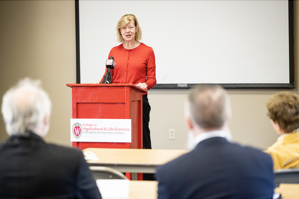 Senator Tammy Baldwin addressed the group, discussing the importance of agricultural innovation in Wisconsin. Photo by Bryce Richter / UW–Madison.
