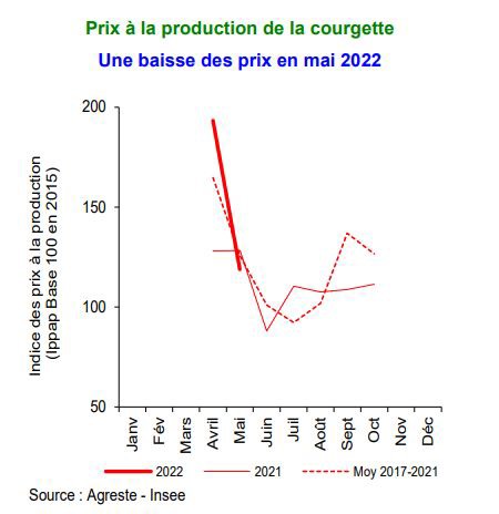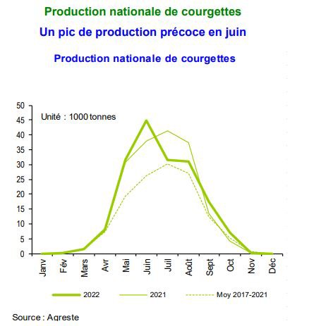 "National zucchini production should reach 166,000 tons, down 2% year-over-year but up 7% from the average of the past five seasons. The forecasted harvests are notably estimated to be down in the Languedoc-Roussillon (-23%) and Rhône-Alpes (-6%) regions due to a decline in surface areas or drought conditions. In contrast, the harvest in Provence-Alpes-Côte d'Azur, the leading production region, is estimated to be slightly up (+1%)."
