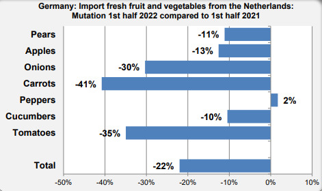 According to the German CBS (SBA), in 2022's first half, that country imported 970,000 tons of fresh fruit and vegetables from the Netherlands. That is 20% less than the 760,000 tons in the first half of 2021. This source shows imports from the country where the crop is grown. In this case, imports of Dutch-grown products.