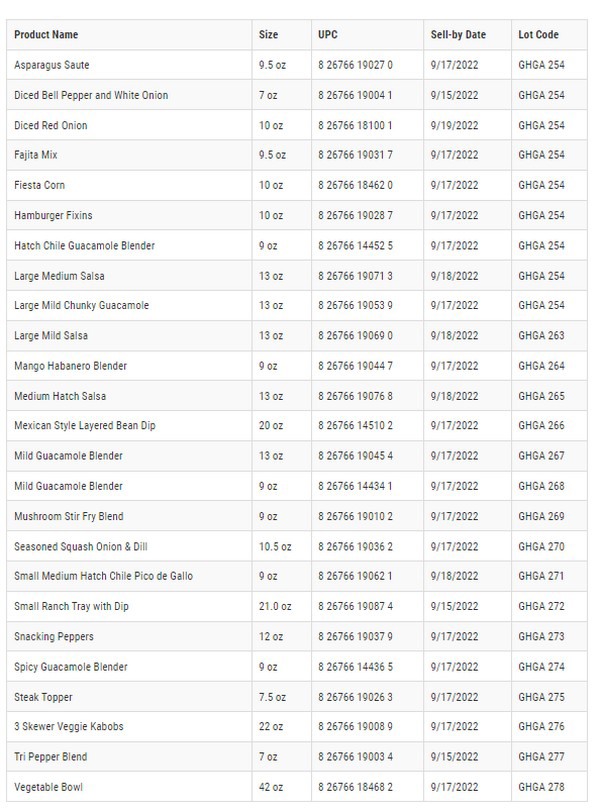 The products were sold to Kroger and distributed to retail stores on 9/11/22. The Sell-by Date has expired, and products were previously removed from store shelves and are no longer for sale. However, products could still be in the possession of consumers. The Sell By Dates and Lot numbers are located on the top primary label of each product. These products were packaged in clear plastic containers and sold primarily in Kroger stores in the produce or deli sections in the states of Alabama, South Carolina, and Georgia.