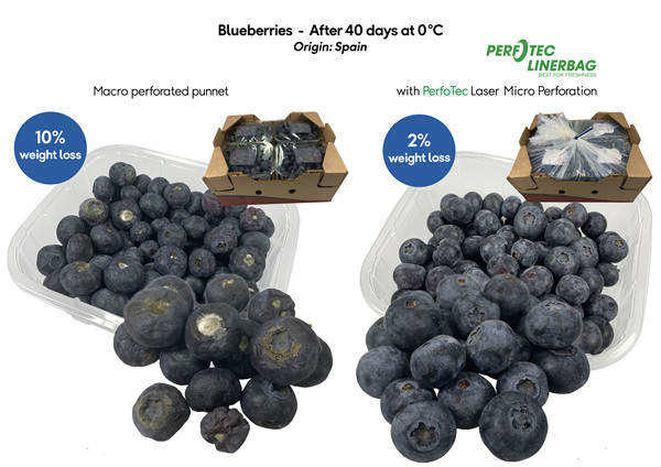 One of the products that a LinerBag is developed for is blueberry. Elisa indicates that research has been done in both static storage trials and during transportation. “After four weeks, the taste is still very fresh and aromatic. Also, there was no dehydration, which means no weight loss. Blueberries stored and transported under similar conditions but without LinerBags, presented dehydration and molds.” She mentions that preventing dehydration is important in more than one way: dehydration weakens the berries giving way to the development of molds.