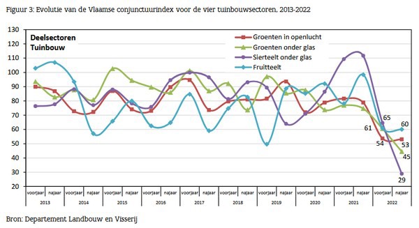 It should come as no surprise that when you ask growers about their confidence in the near future, they are not terribly positive at the moment. The results in this autumn's new Flemish agricultural economic index show that. The index for vegetables outdoors and in greenhouses and ornamental horticulture under glass has not scored this low since the surveys began in 2007. Cost increases, energy supplies and falling consumer confidence are leading to a negative mood in horticulture.