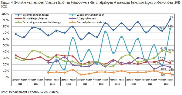 Figure 4: Evolution of share of Flemish agriculturalists and horticulturalists who had issues over the last 6 months (2013-2022). Navy: Total issues, red: financial issues, green: government limitations, light blue: weather conditions, purple: sales issues, orange: animal or plant disease.