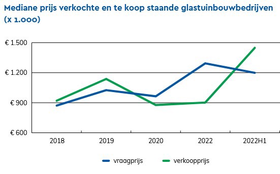 The median price of sold and for sale greenhouse horticulture companies (x1,000). Blue: Asking price, Green: Sale price.