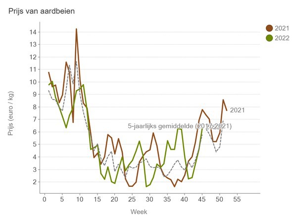 Strawberry prices are increasing again after a difficult period. Last week, a kilogram sold for the median price of €6.35. That increase is in line with the five-year average.