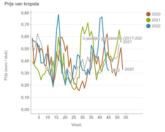 In lettuce cultivation, the switch from outdoor to the greenhouse (i.e., imports from southern Europe) is underway. Here, last week, the median price for lettuce fell to 32 euro cents a head. A considerable price spike was recorded in mid-October, but after that, prices plummeted. Multicolored lettuce average prices have gradually risen, and in week 45, they were at 30 euro cents each.