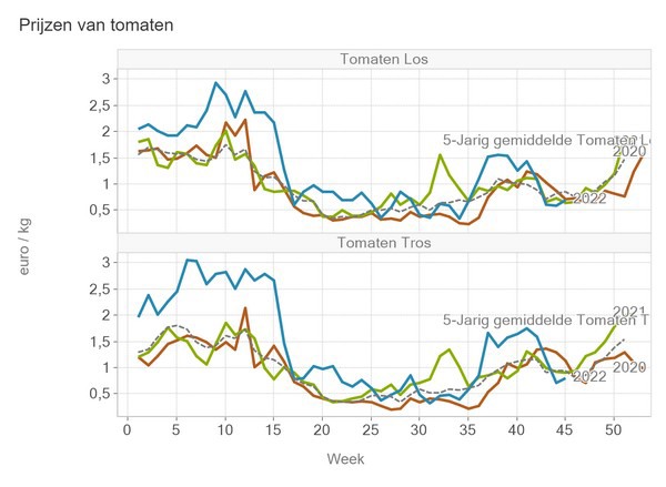 A kg of loose tomatoes fetched, on average, 69.5 euro cents, and a kg of TOV slightly more: 81 euro cents. Supply figures show that these loose tomato prices are much lower than in week 44 but higher than in 2021's week 45. Vine tomato supplies are also higher than last year and last week.