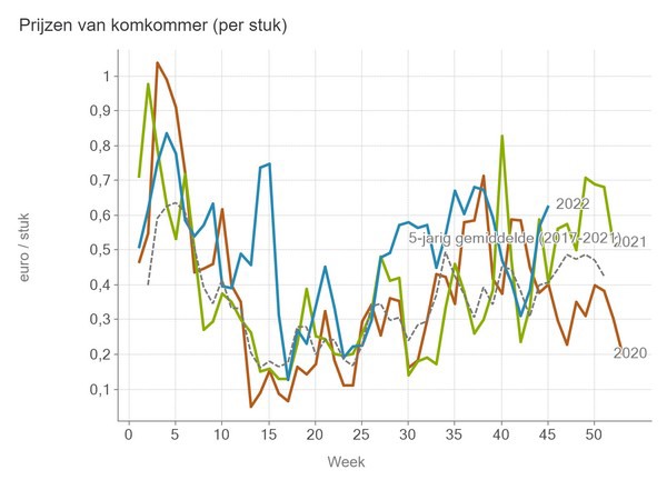The cucumber price is above the five-year average of 41 euro cents. In week 45, those reached a median of 63 euro cents per piece.