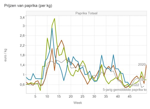 In week 44, yellow bell pepper prices fell especially hard. But, last week, those climbed slightly above the five-year average. Red bell peppers' median price kept declining, though, to below the five-year average.