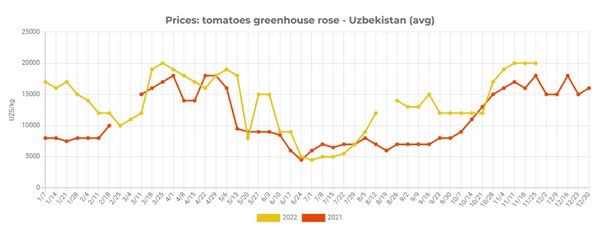 According to EastFruit price monitoring, the average wholesale price for rose tomatoes in Uzbekistan increased only from 19 000 to 20 000 UZS/kg (from $1.71 to $1.78) from 4 to November 25, 2022, and stabilized at the level of 20 000 UZS/kg ($1.78) over the past two weeks. The current average wholesale price for rose tomatoes is 11% higher than last year.
