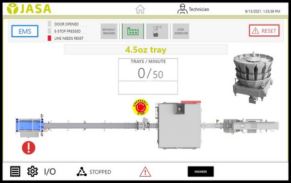 The Rotary Filler features a very user-friendly Human Machine Interface (HMI). This HMI is recipe-driven, and JASA loads recipes for different products and packaging into the interface during installation. This allows for selecting the proper packaging settings with the push of just one button when starting to package a product.