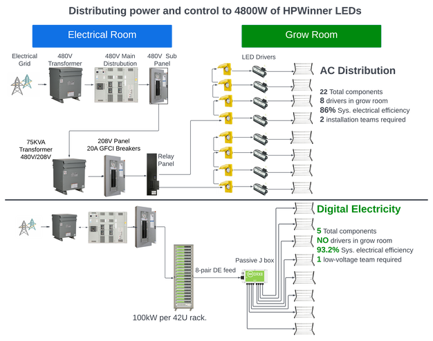 Digital Electricity is a great technological innovation that enables growers to centralize LED power supplies in an electrical room and use ethernet-like wiring methods to distribute both power, lighting controls, and monitoring to LEDs in greenhouses and indoor farms. The technology significantly reduces the cost of building CEA facilities while lowing electricity and maintenance costs.