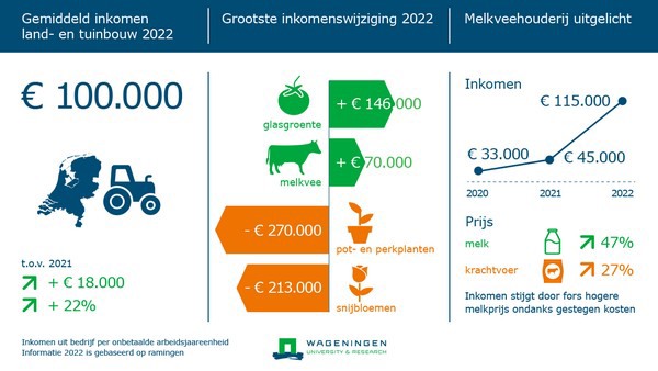 Between and also within the discussed business types in agriculture and horticulture, the differences in revenue are large. This is shown in the yearly revenue estimation of Wageningen Economic Research, led by corporate agricultural economist Harold van der Meulen: "In 2022, we see in all agricultural and horticultural sectors strong cost increases for energy, cattle feed, and artificial fertilizer. In a few sectors, these cost increases are amply compensated with higher sales prices for supplied products like in the dairy sector, arable farming, and greenhouse horticulture. There are agricultural sectors as well, such as pig farming, where sales prices of pigs are insufficiently increased to compensate for the increase in costs. Besides, in other horticultural sectors, the sales prices of flowers, plants, and fruit even dropped by such a degree that it resulted in a substantial decrease in revenue."