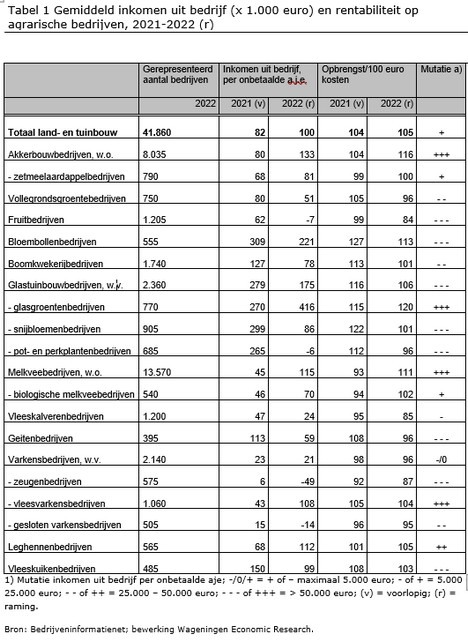 Simultaneously with the revenue estimation of Wageningen Economic Research, the CBS (Statistics Netherlands) presents the macro economical figures of agriculture and horticulture of The Netherlands. The income concept in the agricultural accounts of the CBS differs slightly from the concept in the agricultural sector estimations from the publication of Wageningen Economic Research. The agricultural accounts of the CBS, for example, show results based on the calendar year, while the sector estimation uses the harvest year as a baseline.