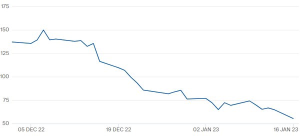 The TTF gas price for February 2023 until January 16. On Tuesday morning, January 17, the gas price fell further to €53.1/MWh. Last Friday, that closed at €64. Click here for the current figures.