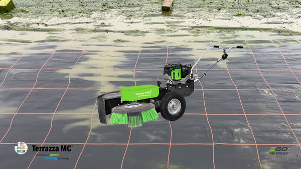 The previous Terrazza GEOTEX-Pro® machine has long been known in the industry and is used by growers of plants, trees, vegetables, and fruit for ecological and easy cleaning of their geotextiles or plastic sheeting (HDPA). The machine is internationally regarded for its patented Terrazza MC technology, which is effective in removing weeds, moss, and algae without the use of chemicals. With the addition of the EGO electric motor, the machine will deliver even better ecological performance.