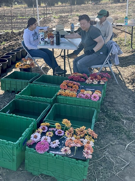 Working with the SCOPE zinnia project at the UC Davis Student Farm are, from left, undergraduate intern Deysi Alvaro, master's degree student and lead student breeder Juliet Han, and SCOPE co-coordinator Antonia Palkovic. (Courtesy Laura Roser/UC Davis)