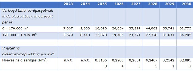 Top to bottom: lowered tariff for gas use in horticulture in euro cents per m2, electricity generation exemption per kWh, amount of gas (Nm2). Click here to enlarge the table.