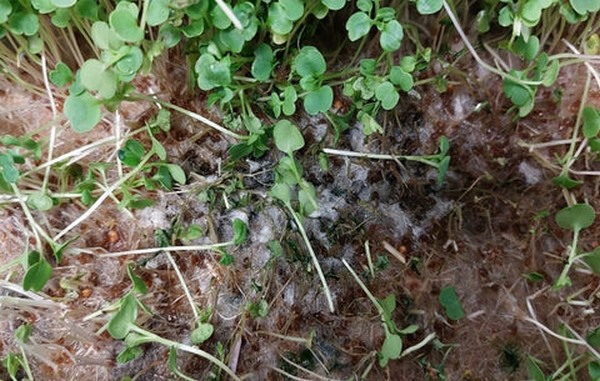 Mold occurrence during microgreen production is not unusual, as mold spores are ubiquitous in ambient air, seed coats can harbor common mold spores, and some microgreen mats introduce additional spores to the cultivation environment. Microgreens are grown at high density, creating a humid under-canopy that favors mold growth. If the mat surface is also saturated and the materials it is made from are susceptible to mold, fungal growth can get out of control and lead to low yield and quality, as well as damping off of seedlings in extreme cases. "Fortunately, ReNy Terra Mats undergo thorough sterilization during manufacturing, and the materials they are made of are not especially susceptible to molding. They also tend to have drier top surfaces due to their increased thickness and the porosity of the material, so they reduce the incidence of mold and help prevent crop damage," the Re-Nuble team says.