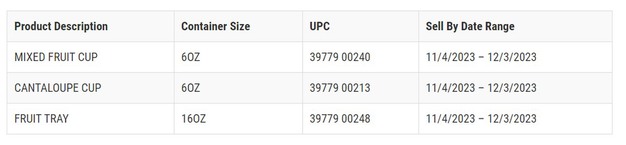 This recall includes the following fresh-cut fruit cup and tray products containing cantaloupe with sell-by dates of November 4, 2023, through December 3, 2023. Products were distributed to Kwik Trip, Kwik Star, Stop-N-Go, Tobacco Outlet Plus Grocery, and Tobacco Outlet Plus convenience stores in the states of Wisconsin, Minnesota, Iowa, Michigan, Illinois, and South Dakota.