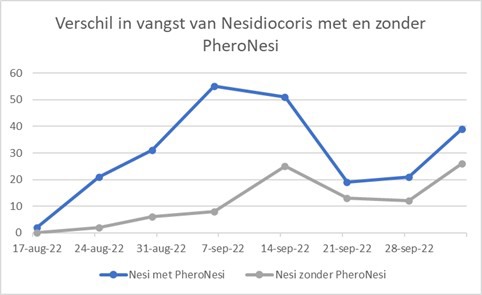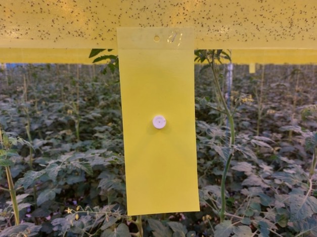 To evaluate the effectiveness of the system, sticky traps without pheromone can be hung and compared with sticky traps with the PheroNesi pheromone. If more Nesidiocoris is caught on the yellow sticky traps with the PheroNesi pheromone, the functionality of the system is confirmed.