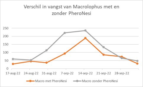 An additional advantage was the repellent effect on Macrolophus, where the presence of a PheroNesi dispenser in the yellow sticky trap resulted in significantly fewer captured Macrolophus (-37%). The values can be found in the graphs and tables below.