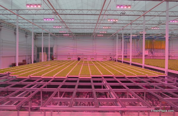 With the help of a robot, salads are transplanted into the larger gutters for the second phase of their growth process.