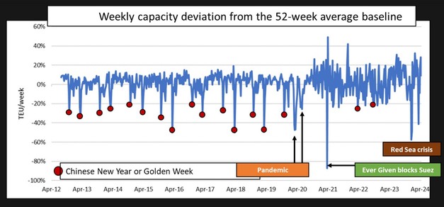 We have marked the “Ever Given” event, and this is clearly seen to have the largest single impact. It should be noted, though, that part of this ended up overlapping with capacity changes related to Chinese New Year that year. Finally, we can very clearly see the Red Sea crisis. With the “Ever Given” as the only exception, this is the largest single event – even larger than the early pandemic impact.