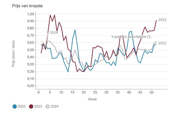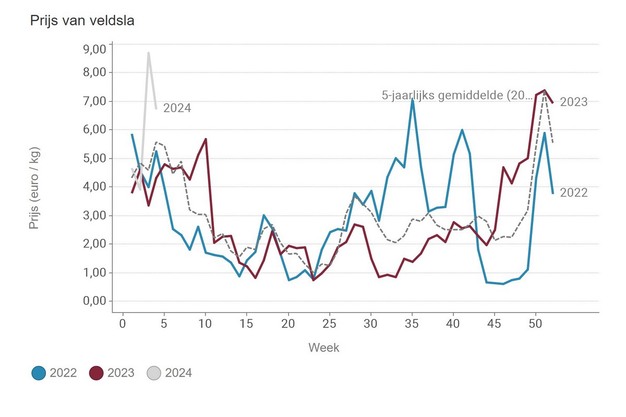 Lettuce and lamb's lettuce have escaped these negative trends. The average price of lettuce is in line with the rising price trend of 2023. The average price for lamb's lettuce is much higher, although the peak was already reached in the previous week.