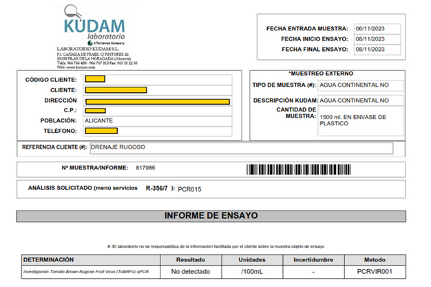 Laboratory water analysis of a sample from the drains obtained from a tomato greenhouse, which is showing no virus detected. A GOgen system is installed in this greenhouse, producing Peroxide UltraPure.