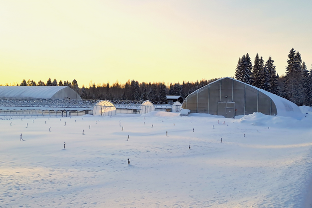 Peuraniemen's greenhouse facilities, comprising approximately 5000 m2 of greenhouses and tunnels are found to be resilient against the harsh Finnish winter conditions. "Our Finland-made greenhouses are made for Finnish circumstances. They are like solo tunnels, very high and deep walls, covered by double plastic to withstand the tough exterior temperatures and heavy snow on the roof without extra heating."