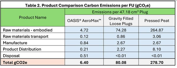 The results of the carbon footprint assessment's plug-to-plug product comparison can be seen in Table 2 below, again based on the Functional Unit of one 47.18 cm3 plug. The Cradle-to-Grave CO2 equivalent emissions of OASIS® AeroMax™ substrate, Gravity Filled Loose Plugs, and Pressed Peat were assessed at 6.40 grams, 80.08 grams, and 278.70 grams, respectively.