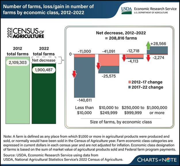 In 2022, farms in the United States numbered 1,900,487, down from 2,109,303 in 2012, according to data from the 2022 USDA Census of Agriculture released in February 2024. That represented a 10-percent (208,816 farms) decline from 2012 to 2022. The Census of Agriculture is a complete count of U.S. farms conducted every 5 years by the USDA National Agricultural Statistics Service. As such, it provides a picture of how different-sized farms, categorized by economic class, changed. In looking at the last two 5-year survey periods, the number of farms decreased in all four farm size categories from 2012 to 2017, represented by the red part of the bars in the chart.