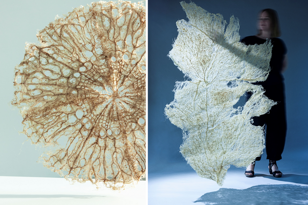 After drying the mats, Zena applies a coating made from kitchen ingredients to maintain moisture and prevent flaking. Which, eventually, will make it solid like leather until it's ready to be transformed into one of her many artworks. Besides the mats, Zena is also creating flat sheets, which are similar to leather-based materials. Currently, she is applying for an R&D grant and patent to further develop her coating.