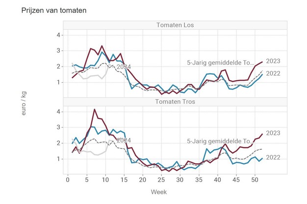 Tomato production remains limited as well. For week 12, this results in an average kilo price for vine tomatoes that is almost identical to that of week 11. Just over 2.16 euros is comparable to the five-year average. The price was higher in the past two years, though.