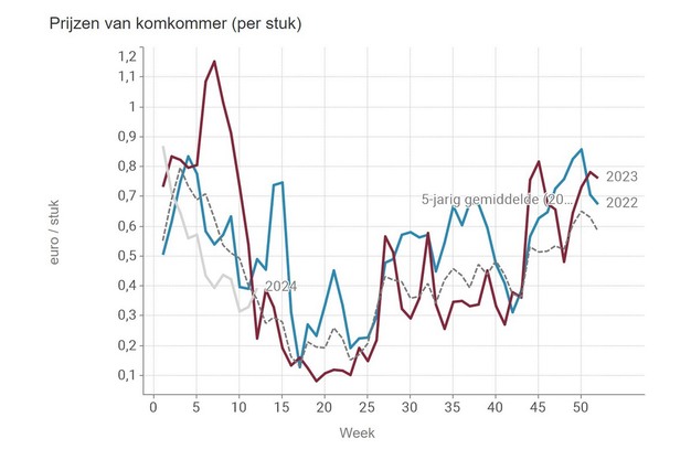 For lettuce, the price is now also above the five-year average. The price movement is quite similar to cucumber, although the price increase here has been steadily ongoing for longer.