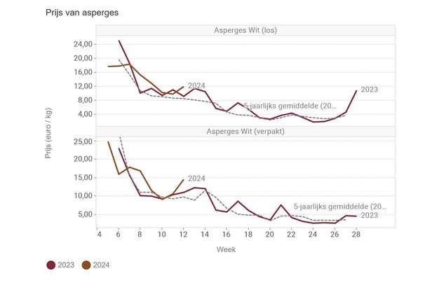 What is notable is a revival of the asparagus price. The price for a kilo of packaged asparagus rises by nearly 4 euros to just over 14.5 euros. A kilo of unpackaged asparagus records just over 12 euros for the entirety of week 12.